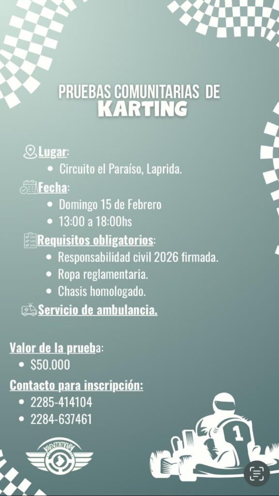 Este domingo el Automoto Náutico Laprida retomará una actividad muy esperada por los amantes del karting. Desde las 13 y hasta las 18 horas se realizarán pruebas comunitarias, abiertas a pilotos locales y de la región