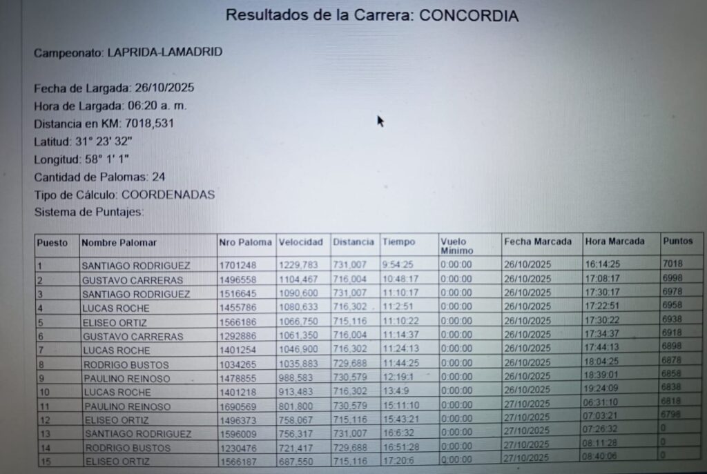 El pasado sábado 25 de octubre, a las 6.20 horas, se realizó la suelta de Pichones y Mixtos desde Concordia, Entre Ríos, correspondiente a la primera carrera de fondo del calendario 2025.