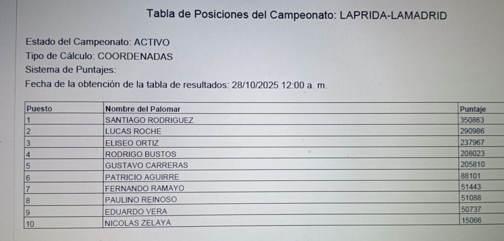 En cuanto a la Copa La Madrid–Laprida, el ganador fue también Santiago Rodríguez (palomar “San Vicente”), escoltado por Gustavo Carrera y Lucas Roche, ambos representantes de la vecina localidad de General La Madrid.