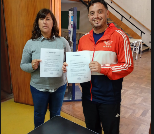 “Porque creemos que ni la Escuela ni las familias pueden ni deben hacerlo solas, abordamos ssu convocatoria” expresa textualmente la presentación de SUTEBA, con las firmas de Paula Cruz Inspectora Jefa Distrital recibiendo la nota y el Secretario General de SUTEBA Laprida, Alan Olivera.