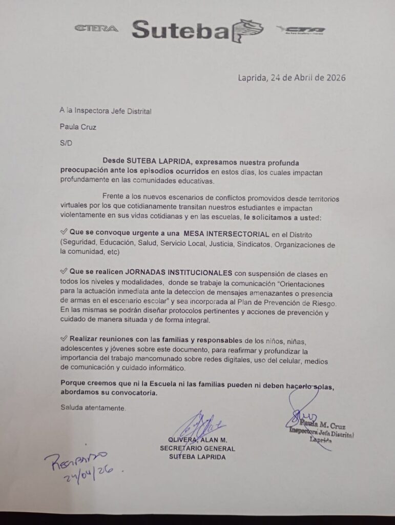 Ante los hechos acontecidos en nuestro distrito la semana anterior con las amenazas en la Escuela Secundaria N°1, desde SUTEBA Laprida se realizó una presentación a la Jefatura Distrital donde el gremio docente bonaerense solicita: