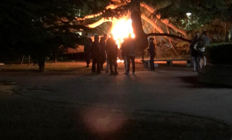 Según informaron fuentes policiales, los sujetos, mediante el uso de un acelerante o elemento similar, prendieron fuego un colchón que había sido colocado previamente debajo de uno de los pinos del lugar.