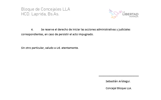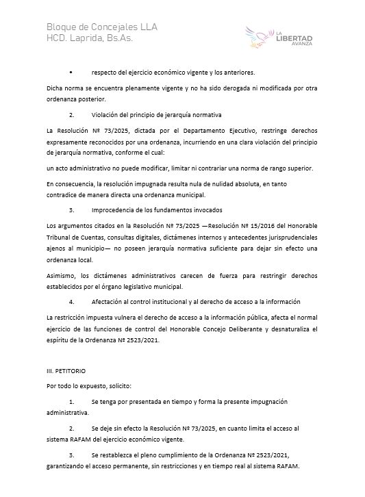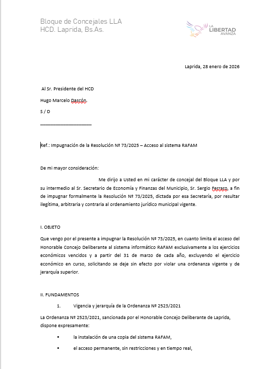 El concejal Sebastián Arístegui, del bloque La Libertad Avanza, presentó este miércoles una impugnación formal contra la Resolución Nº 73/2025, dictada por el secretario de Economía y Finanzas del Municipio de Laprida, Sergio Ferraro, mediante la cual se restringe el acceso de los concejales al sistema informático RAFAM
