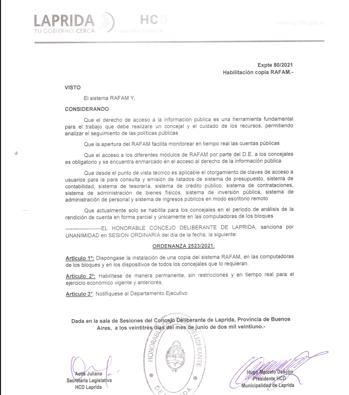 Pirozzolo repasó el origen del acceso al sistema. Explicó que en 2016 el Tribunal de Cuentas de la provincia de Buenos Aires habilitó a que todos los concejales bonaerenses pudieran acceder al RAFAM en tiempo real. En Laprida, ese acceso se concretó recién en 2021, tras el trabajo conjunto entre bloques, y fue aprobado por unanimidad.