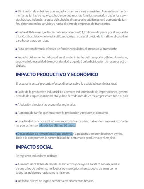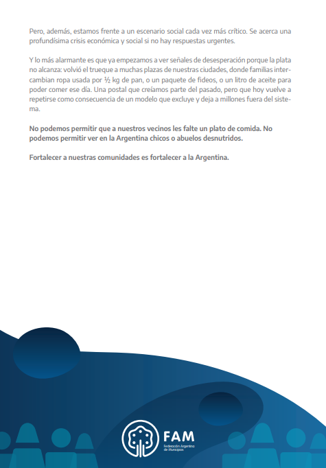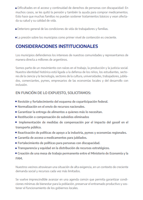 El documento entregado incluye una serie de demandas vinculadas a la crítica situación que atraviesan los municipios. Entre los principales puntos se destacan: