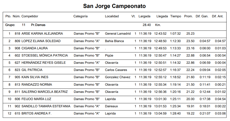 En la prueba de 28K femenino fue victoria de la lamatritense Arse Karina (damas promo B), la bahiense Eliana López en segundo lugar y completando el podio Laura Ciganda en tercer lugar. A continuación, la clasificación.