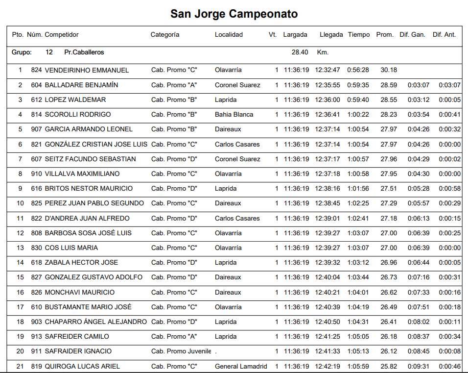 Entre los caballeros, 28K la competencia de la adjudicó Emmanuel Vedeirnho de Olavarría (categoría Caballeros Promo C), mientras que Benjamín Balladare de Coronel Suárez (cab. Promo A) y Waldemar López de nuestra ciudad (cab. Promo B) en segundo y tercer lugar respectivamente, completaron el podio.